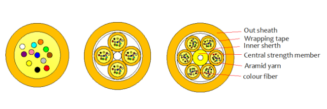 26-144 core mini-optic cables are used as a subunit (250μm color fiber, aramid yarn is a reinforcement element, 3.0mm inner sheath), a fiber-reinforced plastic (FRP) positioned at the center of the core as a non-metal strengthening, the subunit is surround the FRP around, the subunit is a PVC or LSZH material sheath, and the last layer of polyvinyl chloride (PVC) or low-smoke halogen-free material (LSZH, low-smoke, halogen-free, flame retardant) jacket.